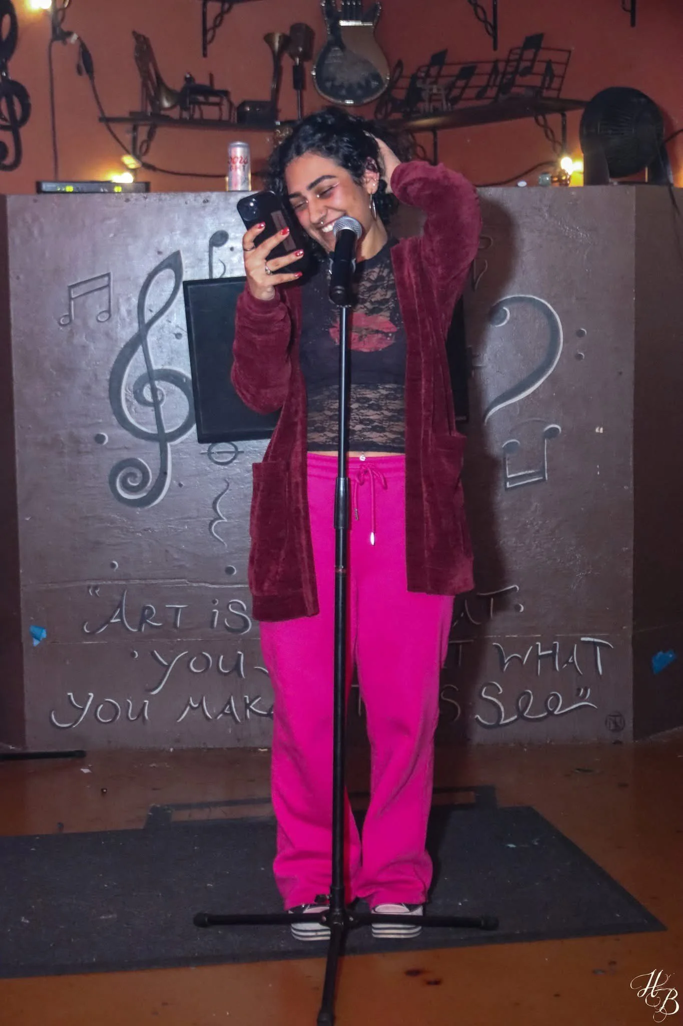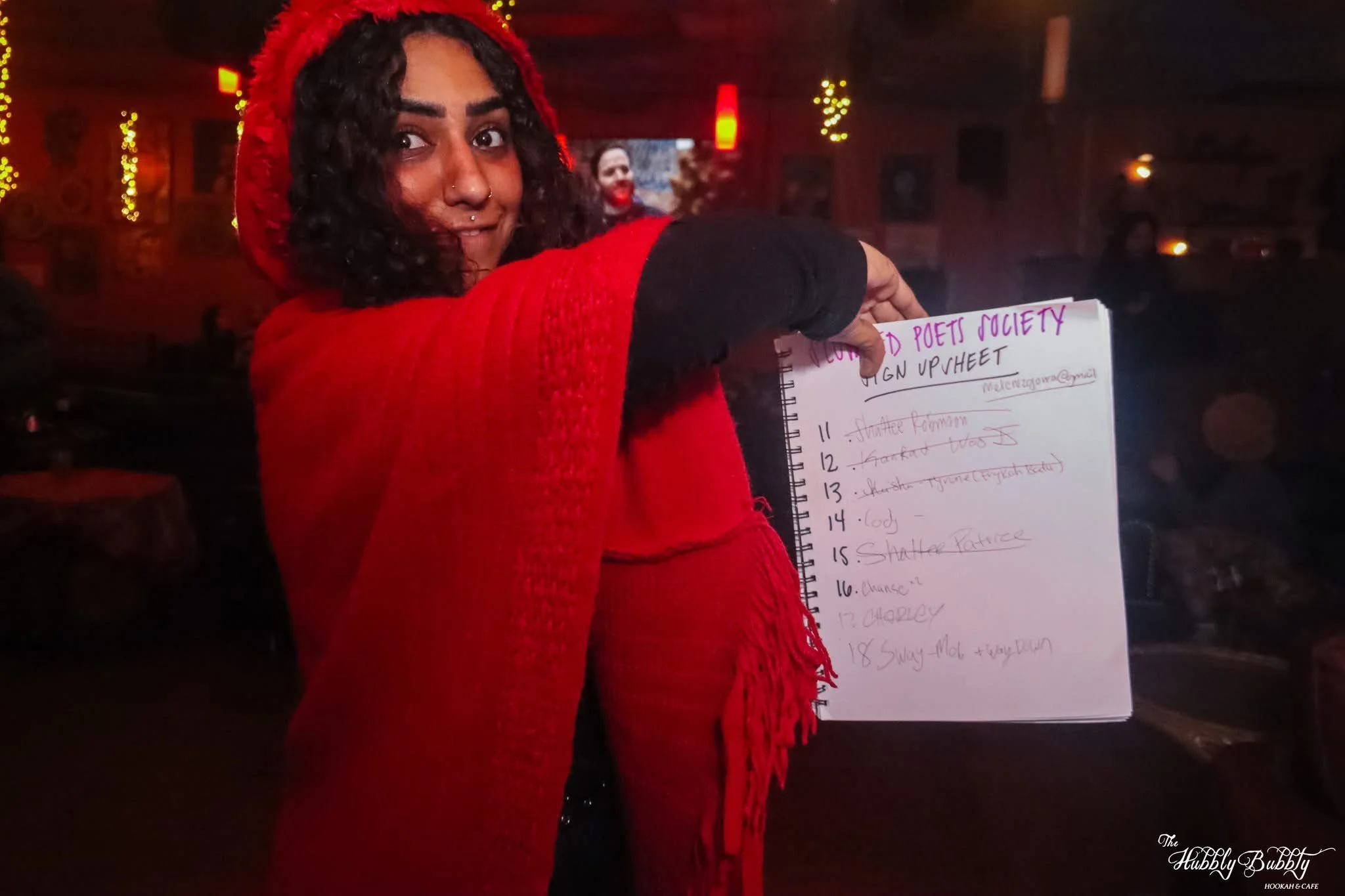 Melanie had always been big on community, but she often felt like she didn’t really have friends. Then, one night, by sheer coincidence, someone approached her with an offer during a Haus Lab Halloween event in 2024. Her now dear friend Will told her he had seen her poetry on social media and said he could help her get an open mic spot. “I know it was God’s timing, because after that, it took less than three days to get it all figured out,” Mel explained. When talking about the aspirations behind her open mic night, she told me her hope was simply to create a space where people could feel comfortable hanging out with one another. A space for people to be themselves and grow in their community. Her Instagram handle was already “Slumped Poet”, so the name “Slumped Poets Society” was decided fairly quickly, partially inspired by the movie Dead Poets Society, and the idea that she is “slumped off the bars of poetry.” The art of poetry is ever so complex and mind-boggling, so I myself love the name! She promoted Slumped Poets Society all October and started official open mics in November at Hubbly Bubbly in OKC.